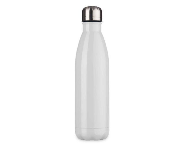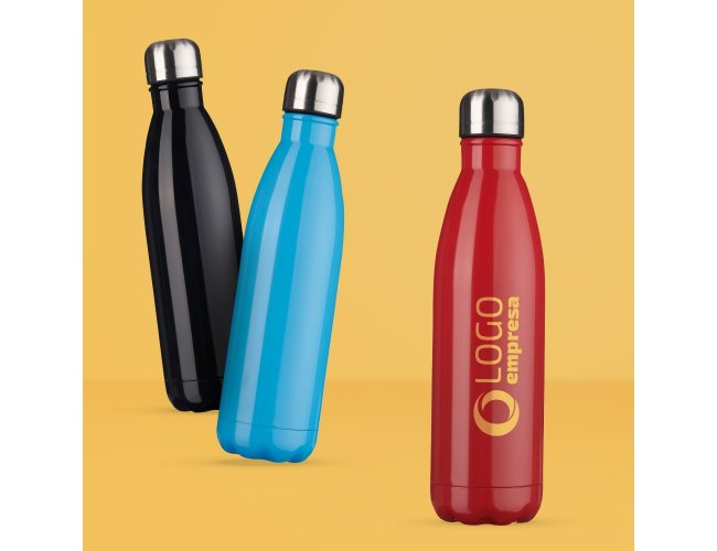 Garrafa 750ml em inox com tampa rosqueável e pintura brilhante. Obs.: Não é um modelo térmico.
