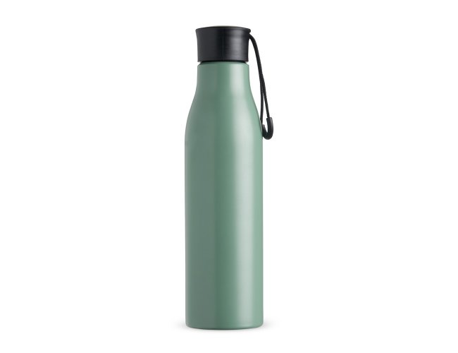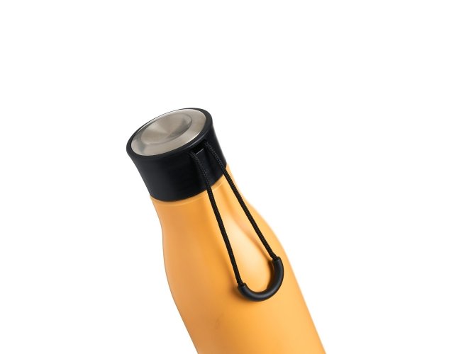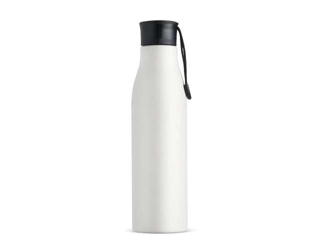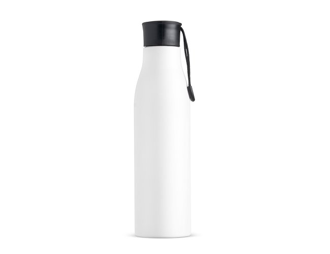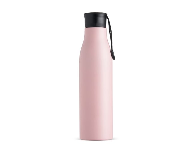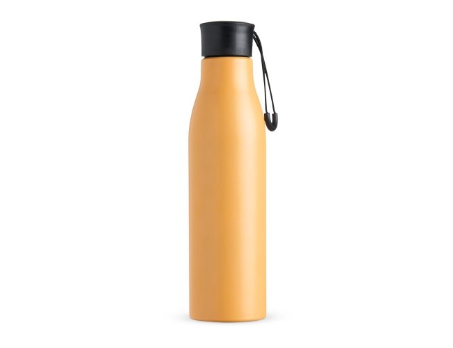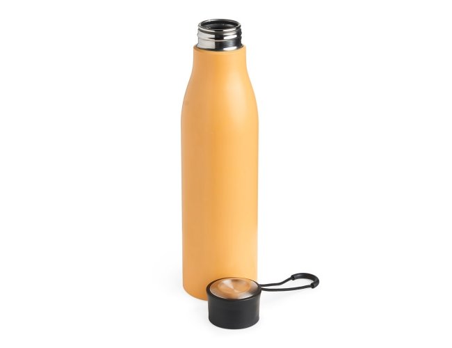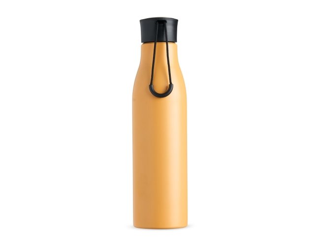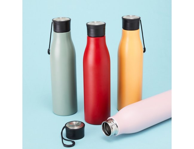 Garrafa inox 800ml com pintura colorida. Possui tampa rosqueável com alça para transporte.