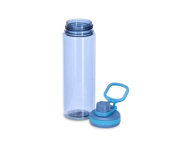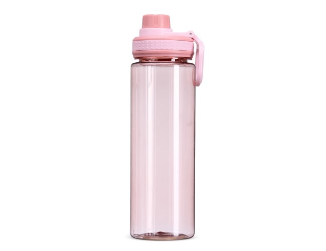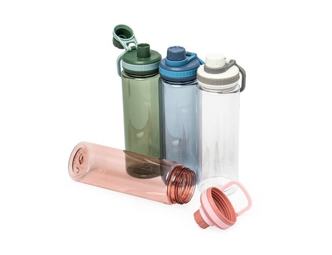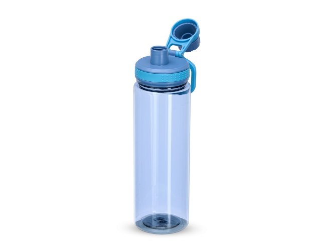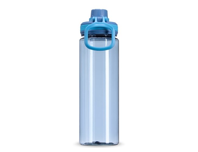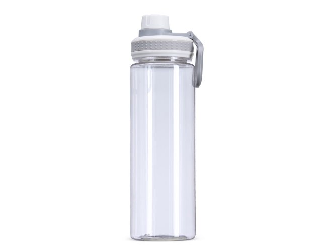 Garrafa plástica de 750ml com tampa rosqueável e bocal, tampa protetora e alça para facilitar o transporte.