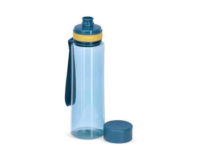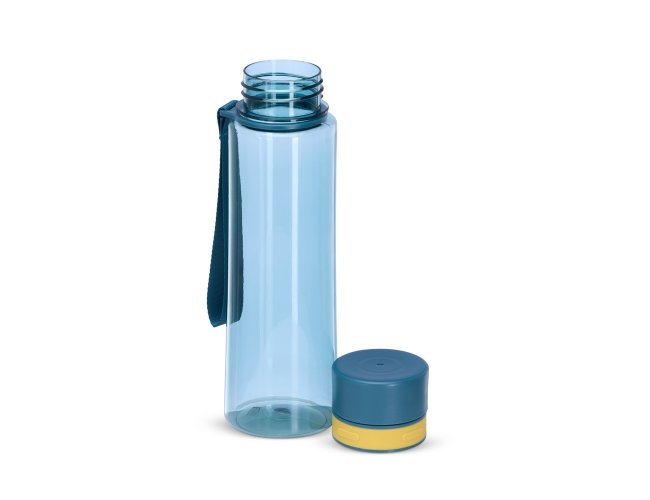 Garrafa de 780ml com tampa rosqueável e bocal, tampa protetora e alça em nylon para facilitar o transporte.