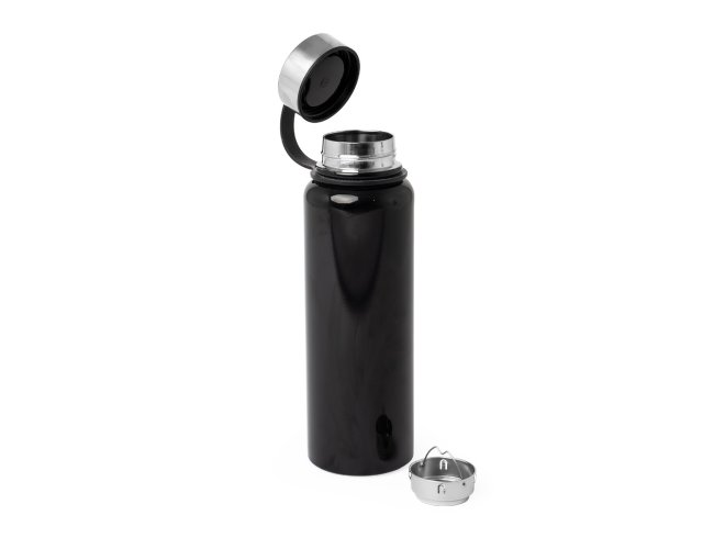 Garrafa térmica com infusor de bebidas, feita em inox 304 com capacidade de 1 litro. Contém base antiderrapante e alça de silicone acoplada na tampa.
