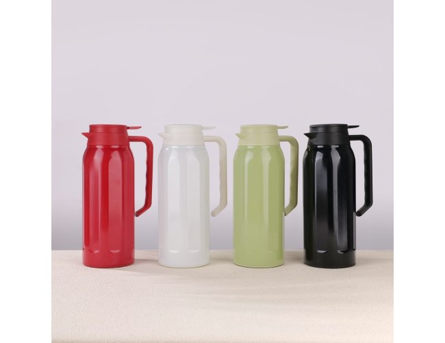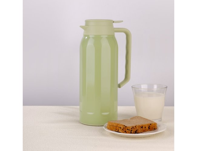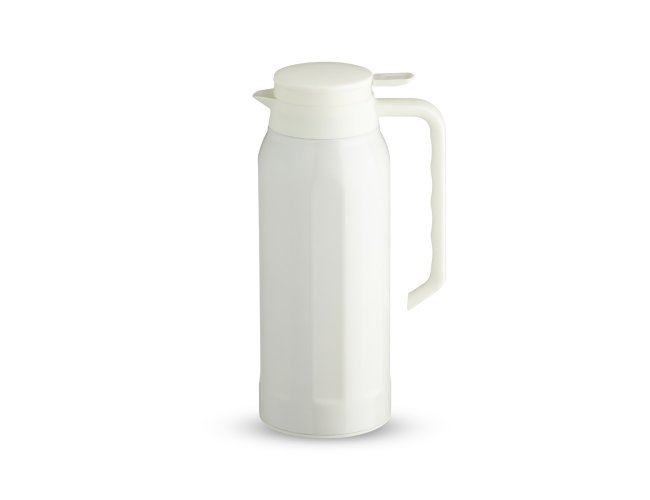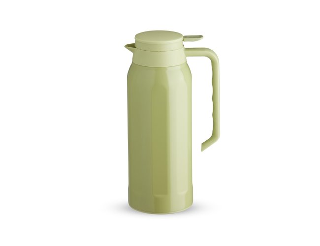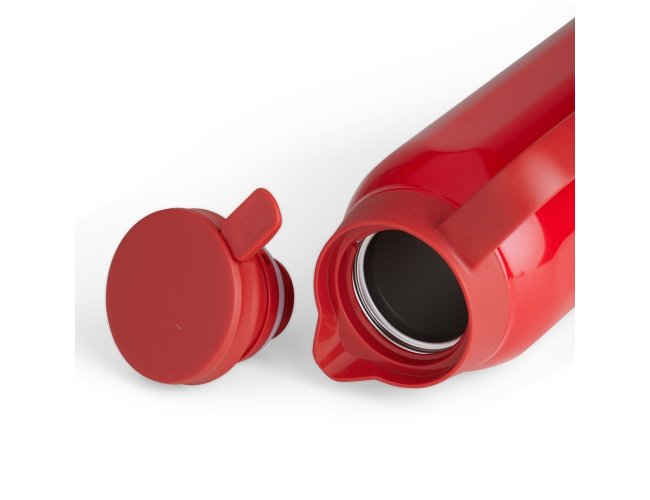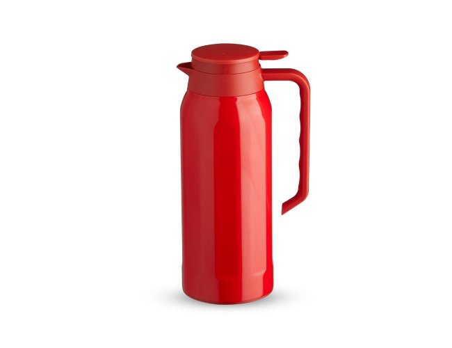 Garrafa térmica com capacidade de 1,4 litros, fabricada em aço inoxidável, possui parede dupla e tampa com alavanca de acionamento. Com tampa, alça e base plásticas, a garrafa possui um design com ondulações em relevo e acabamento brilhante.