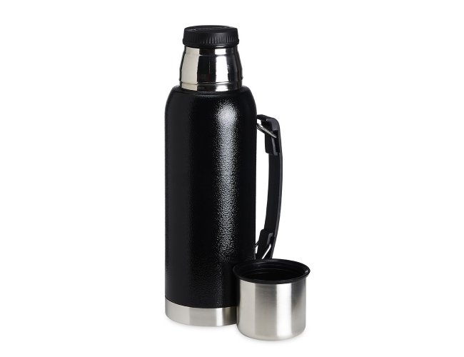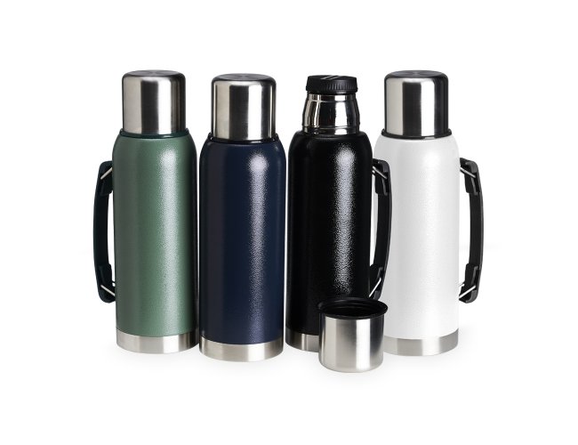 Garrafa térmica de inox livre de BPA com capacidade de 1 litro. Contém alça para transporte.
