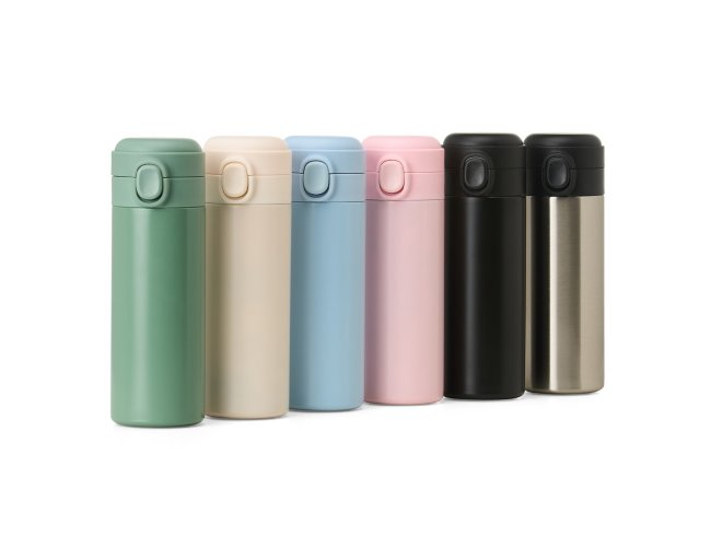 Garrafa térmica em inox com parede dupla, capacidade de 400ml. Tampa com botão central para abertura e borracha interna para vedação.
