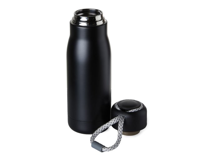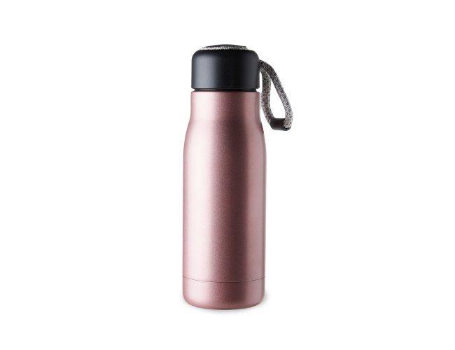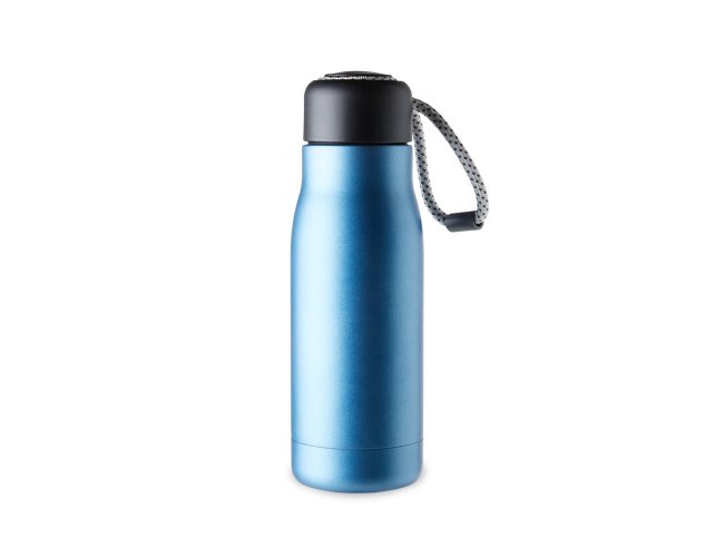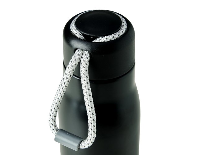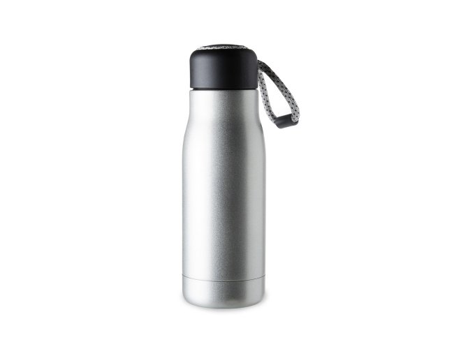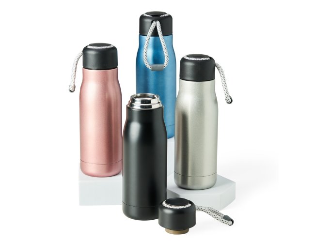 Garrafa térmica com capacidade de 420ml feita em inox 304 com parede dupla. Tampa plástica com corda para transporte embutida.