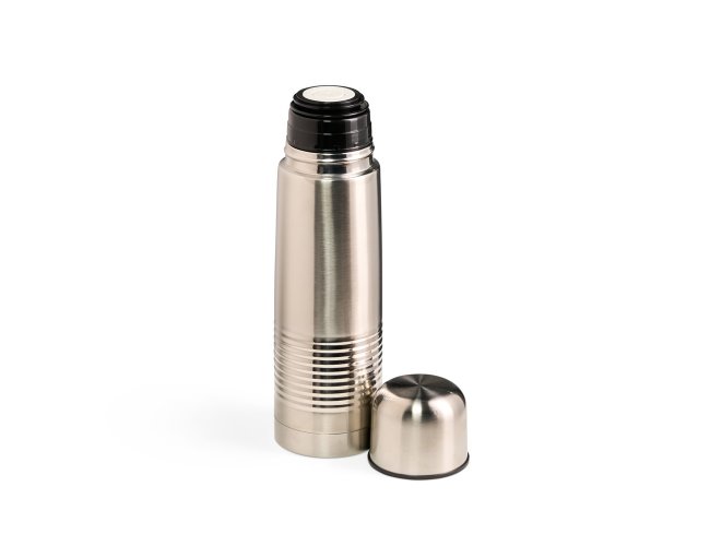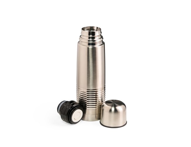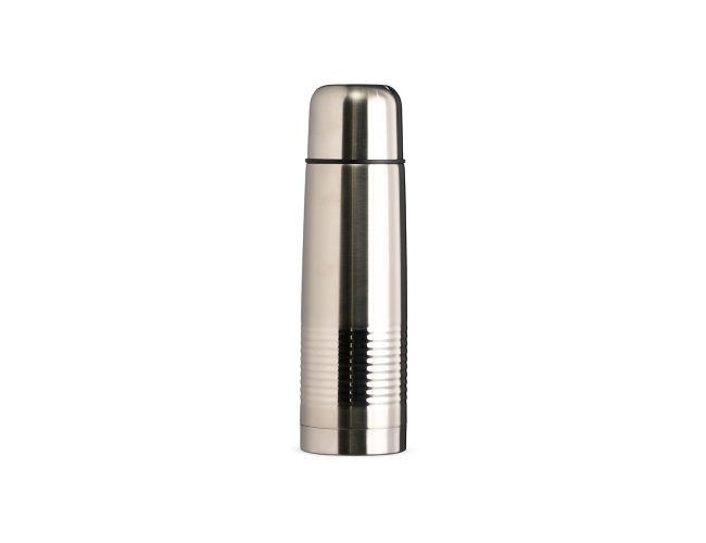 Garrafa térmica feita em inox com parede dupla, capacidade de 500ml.