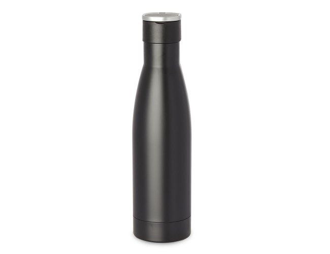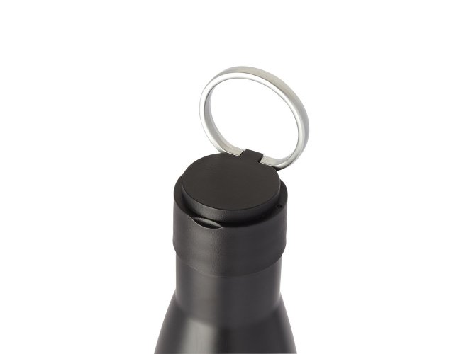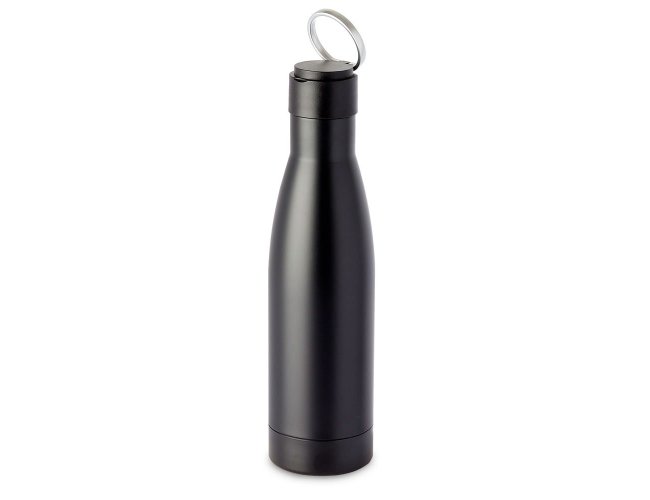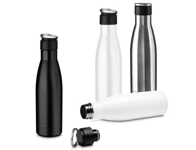 Garrafa térmica feita em inox 304 de parede dupla com capacidade de 500ml, tampa plástica com alça para transporte.