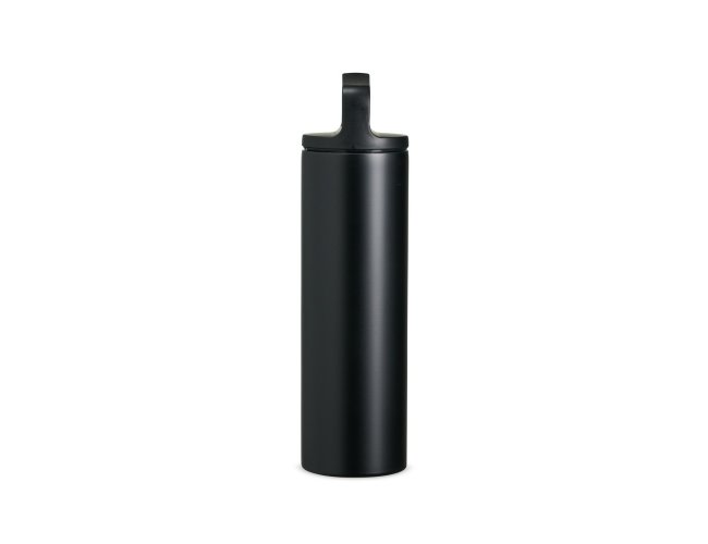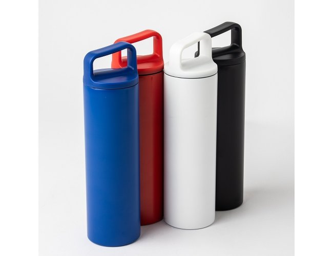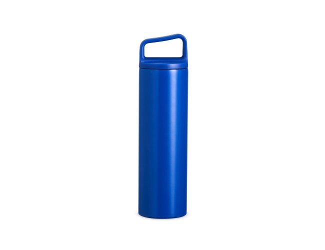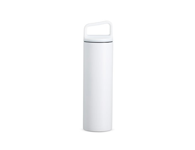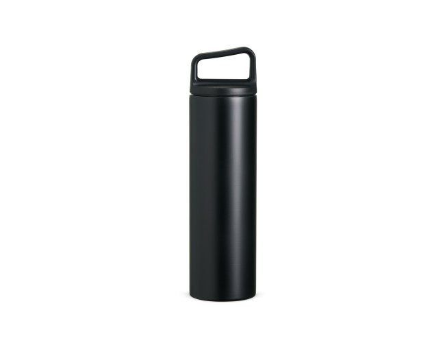 Garrafa térmica em inox, com parede dupla e capacidade de 600ml. A tampa é plástica rosqueável e possui alça acoplada.