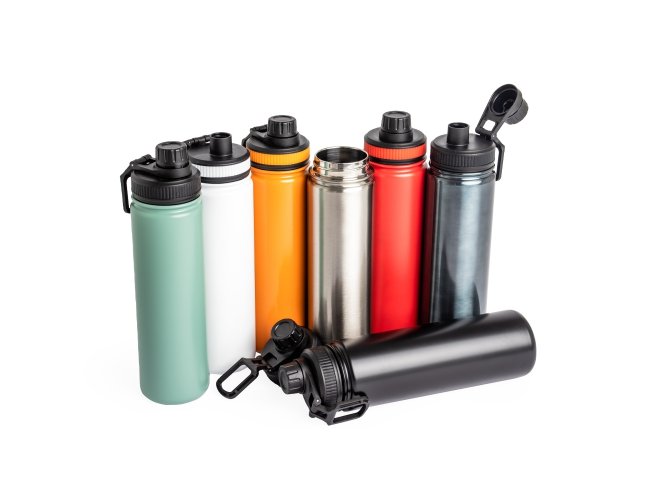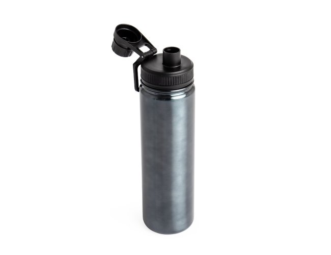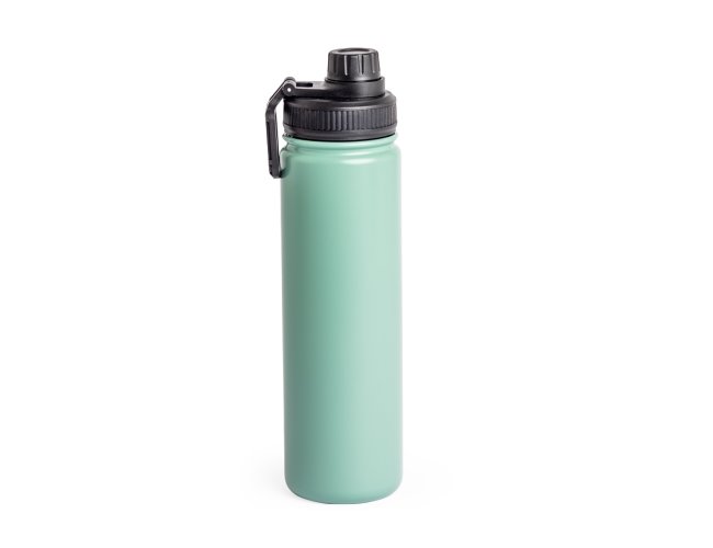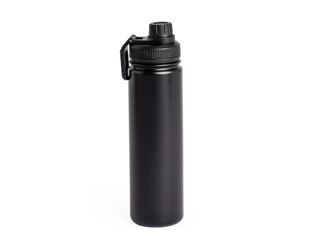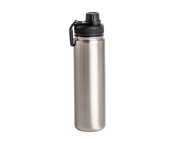 Garrafa térmica com capacidade de 650ml em inox com parede dupla, contém tampa plástica rosqueável com bocal e alça para transporte acoplados.