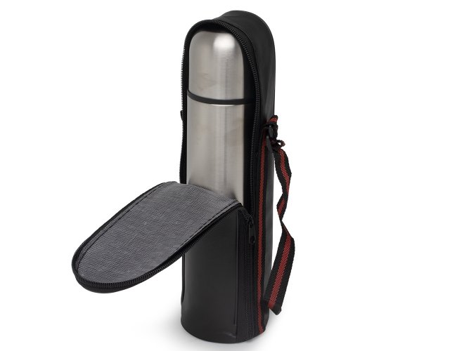 Garrafa térmica feita em inox parede dupla com capacidade de 750ml, acompanha capa de couro sintético com alça de nylon.