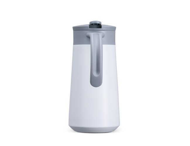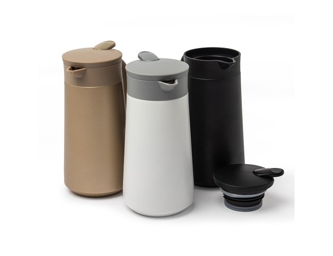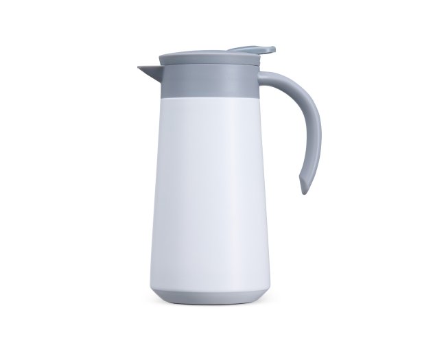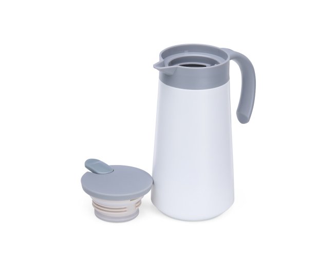 Garrafa Térmica feita em Inox 304 com parede dupla e capacidade de 800m. Tampa rosqueável com alavanca que abre/fecha para servir a bebida.