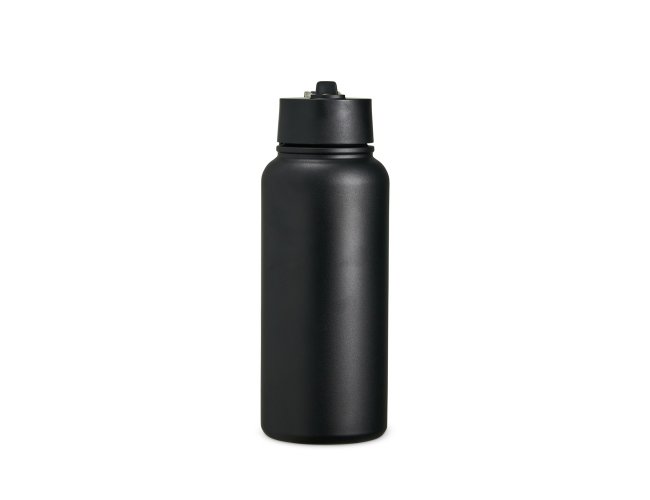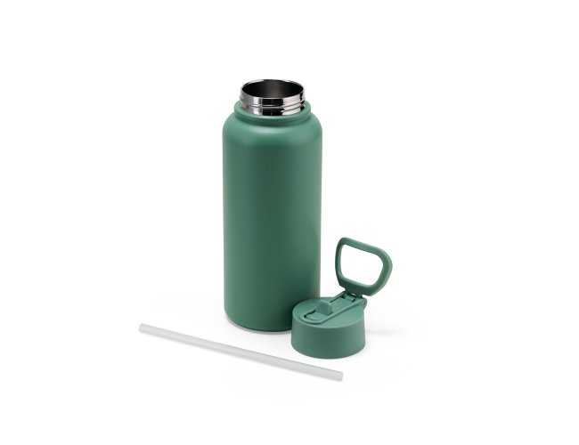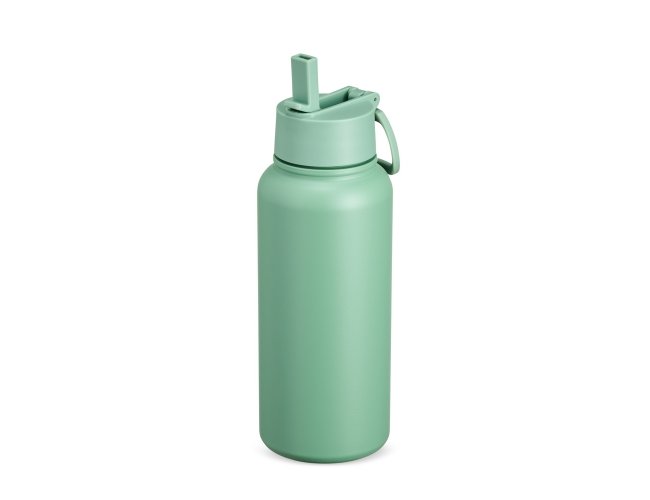 Garrafa térmica de parede dupla em inox, capacidade de 900ml. Tampa rosqueável com alça de transporte, bico flip e canudo interno.