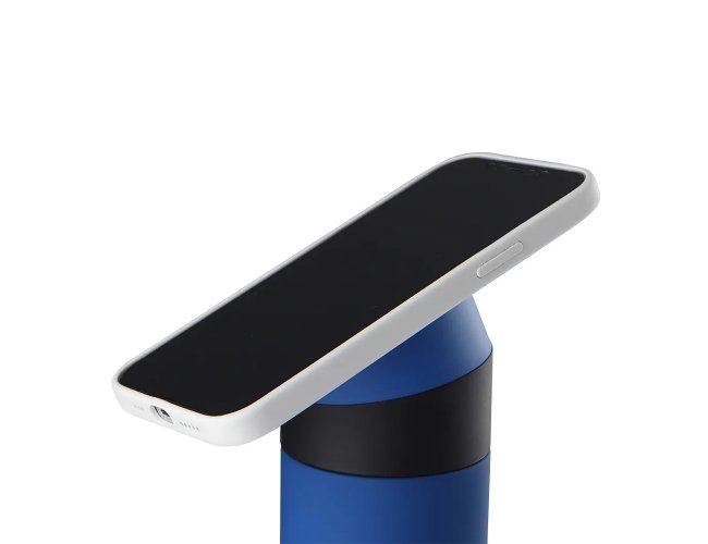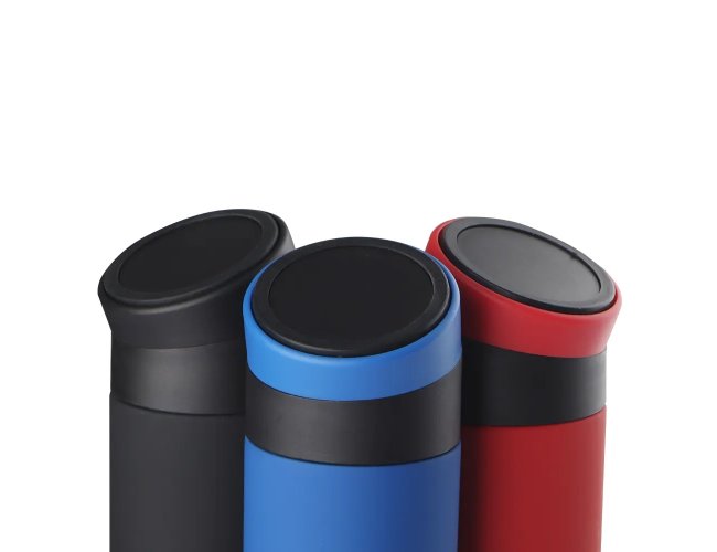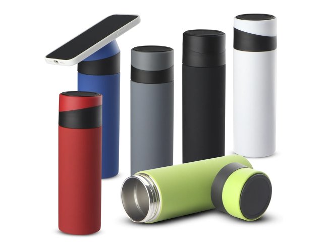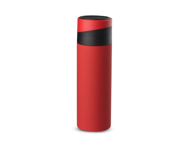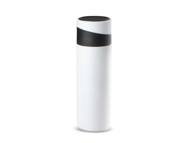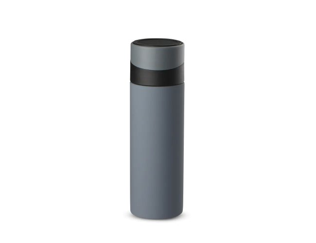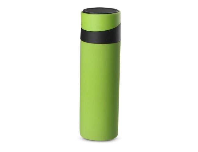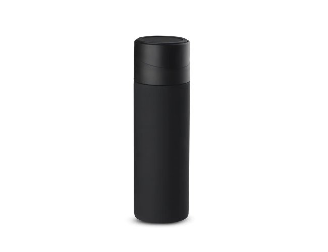 Garrafa térmica em aço inox com parede dupla 400 ml. Tampa rosqueável com apoio para celular.