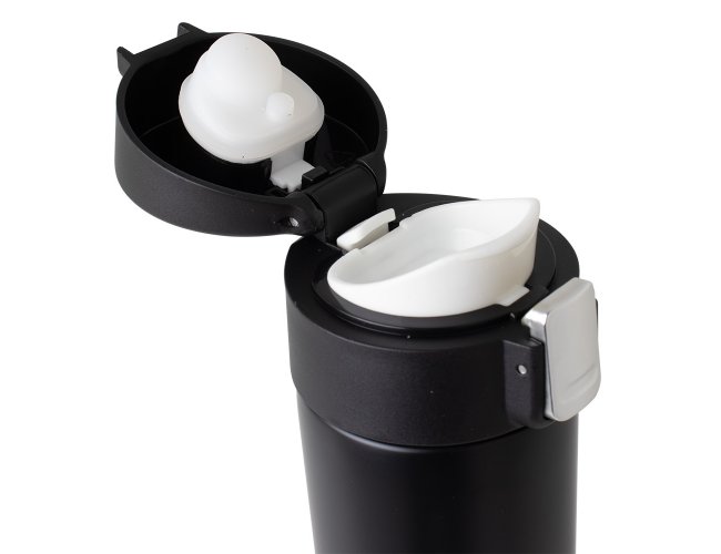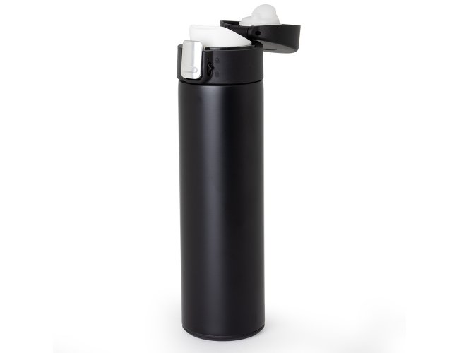 Garrafa Térmica 450 ml em inox com sistema de trava. Contém acabamento fosco e revestimento interno em inox, possui tampa plástica fosca com borracha interna para vedação, evitando o vazamento de líquido, botão central para abertura e trava lateral (basta seguir a orientação dos desenhos de cadeados, simulando o travamento/destravamento da tampa).