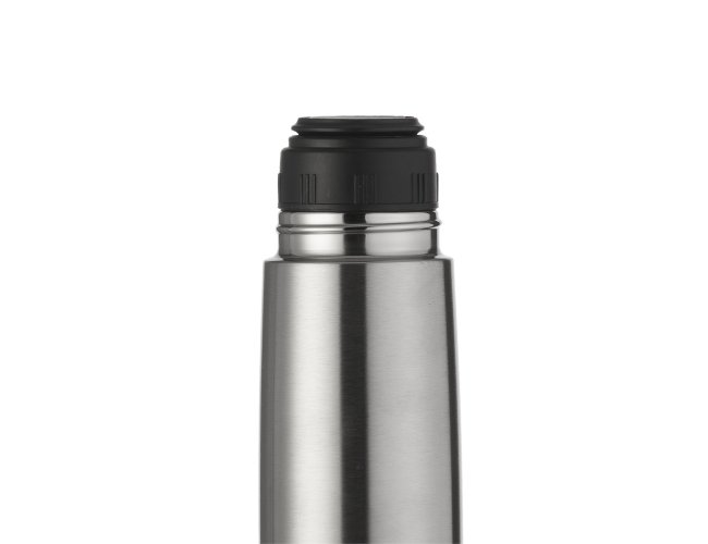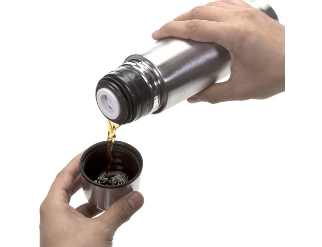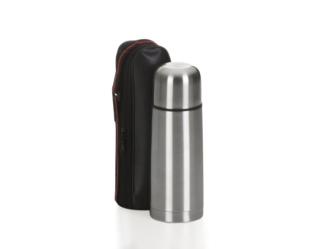 Garrafa térmica 350ml em inox com tampa rosqueável, tampa interna em plástico resistente(basta um clique para abrir ou fechar). Acompanha capa protetora de couro sintético com alça de nylon.