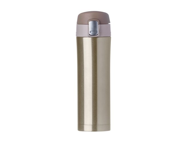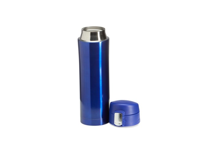 Garrafa térmica de 450ml de inox colorida com botão de abertura prata. Possui um sistema de trava com desenho indicativo de cadeados(aberto e fechado), ao levantar o botão pequeno basta pressionar o botão central maior para abrir a tampa(possui na parte interna borracha protetora evitando vazar o líquido). Para abrir a tampa por completo basta rosqueá-la, parte interna revestida em inox.