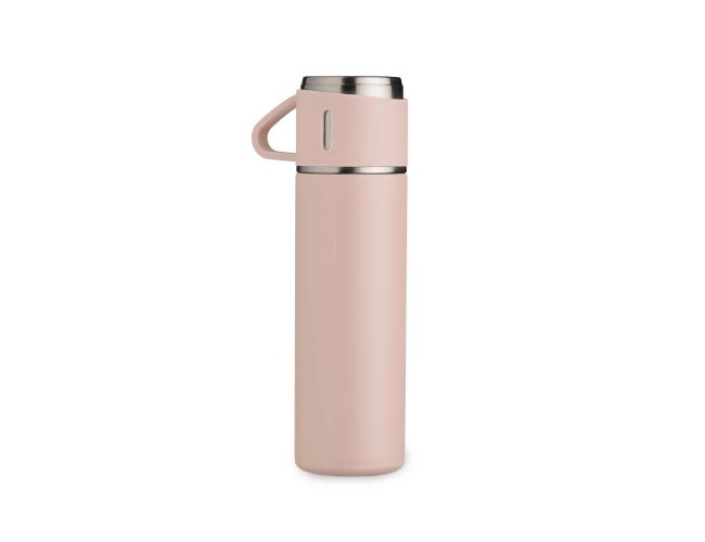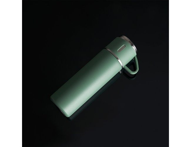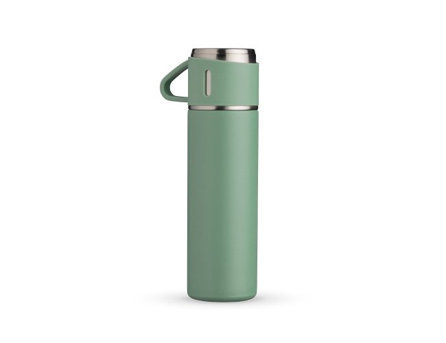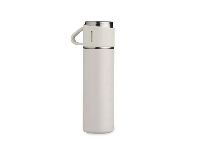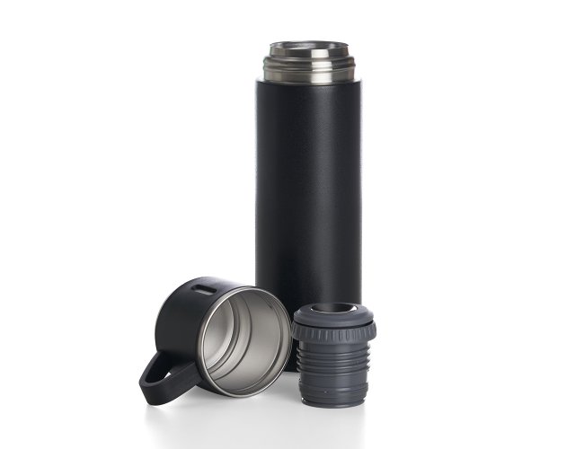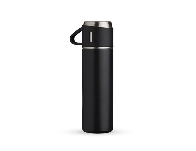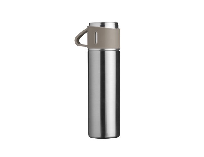 Garrafa térmica 450ml em inox com tampa que pode ser utilizada como caneca, tampa interna em plástico resistente (basta um clique para abrir ou fechar), base com borracha antiderrapante.
