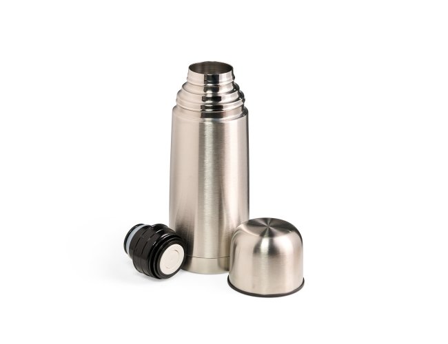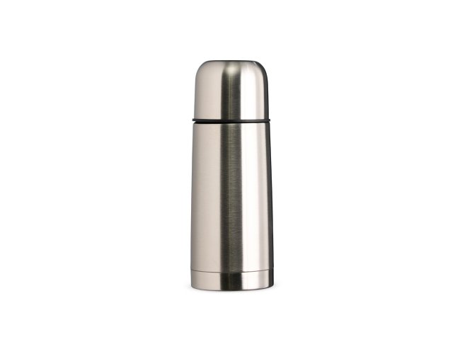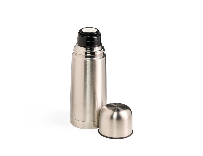 Garrafa Térmica feita em inox com capacidade de 500ml. Contém tampa utilizável como copo e botão interno de acionamento para abrir e fechar o bocal
