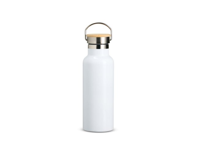 Garrafa de inox com capacidade de 500ml, tampa em inox com detalhe em bambu e alça de transporte.