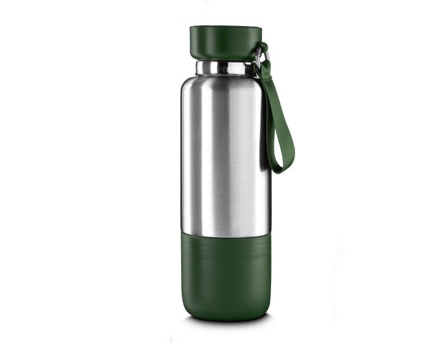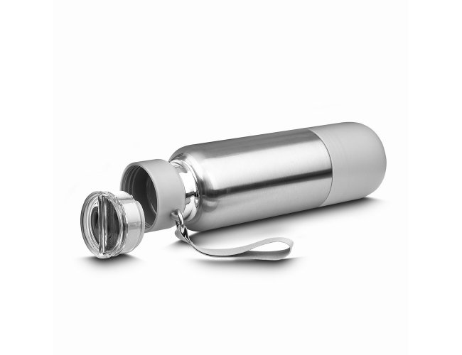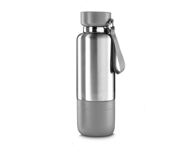Garrafa térmica de 500ml em inox, com parede dupla e cordão tipo mosquetão. Possui tampa rosqueável, com uma tampa plástica na parte superior, que inclui um cordão adicional grande para substituição. A garrafa também conta com um copo adicional rosqueável na parte inferior.