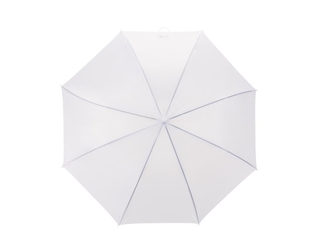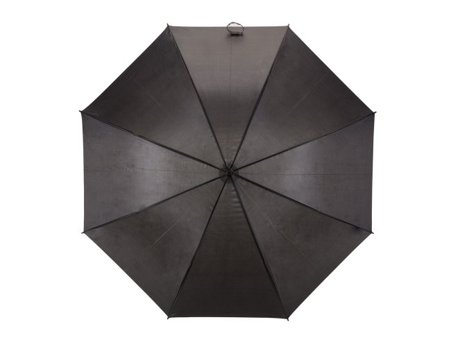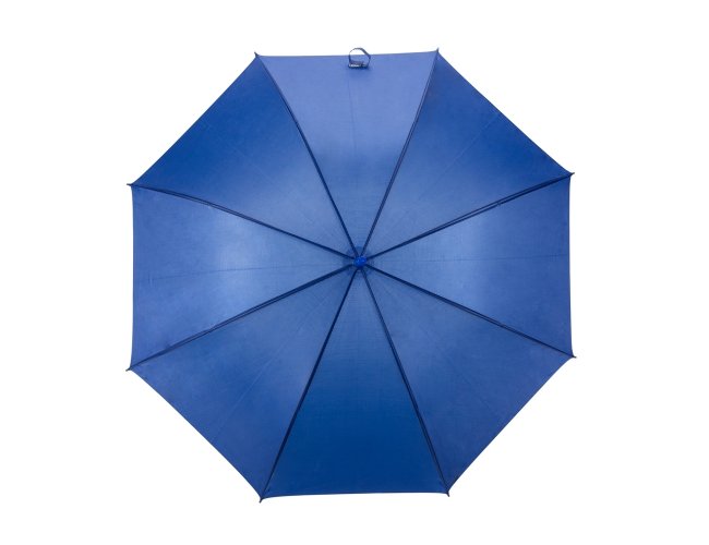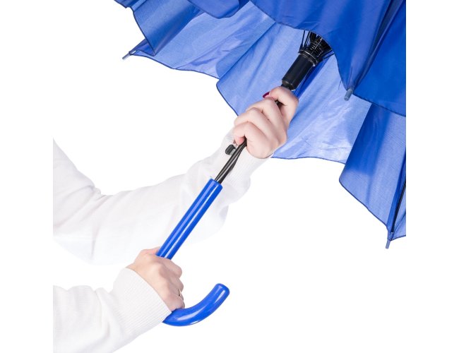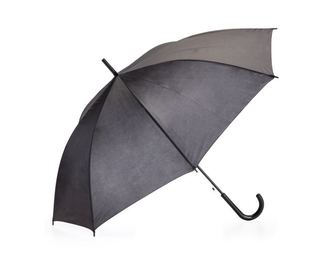 Guarda-chuva com tecido de nylon e abertura automática, basta acionar o botão inferior. Possui 8 varetas pretas de aço, pegador e bico superior de plástico.