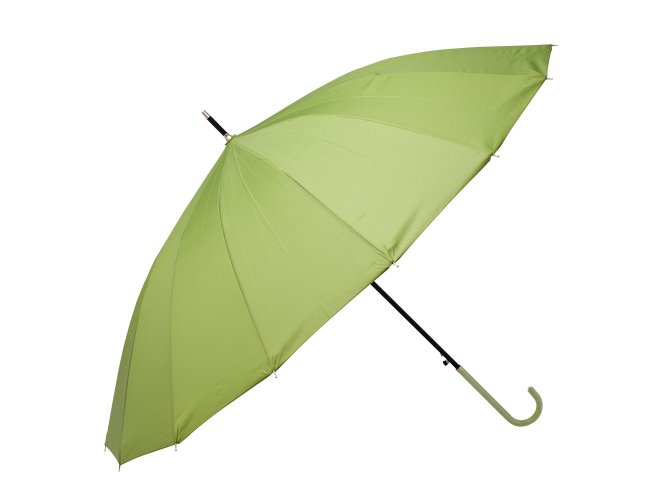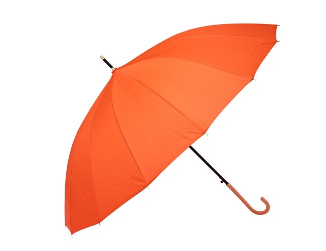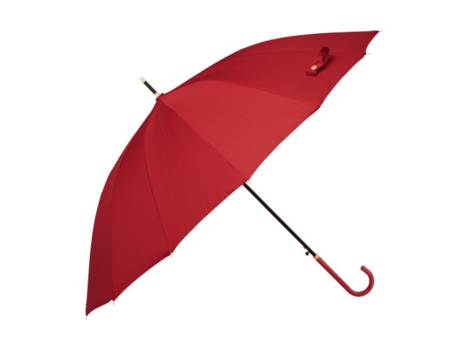Guarda-chuva de poliéster com abertura automática, estrutura em aço e 16 varetas em fibra de vidro. Possui pegador em couro sintético com botão de acionamento.