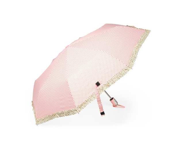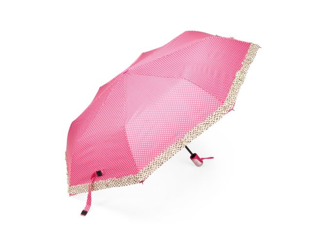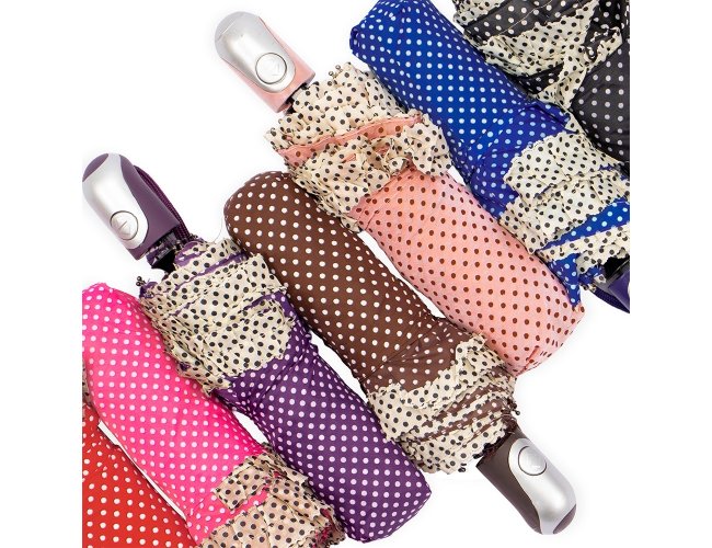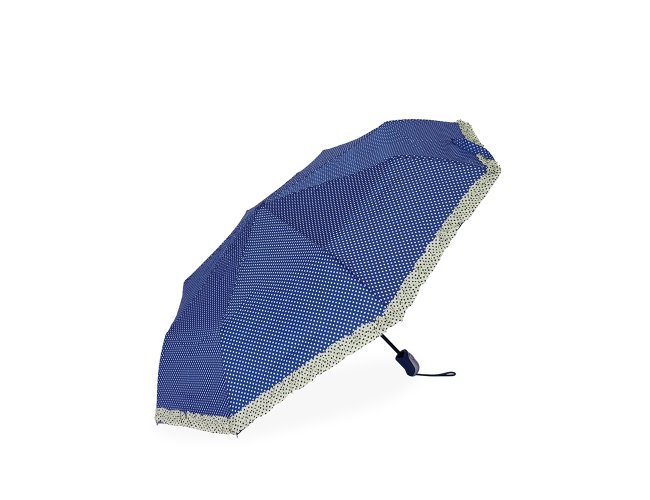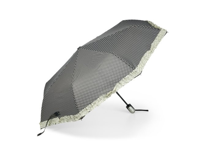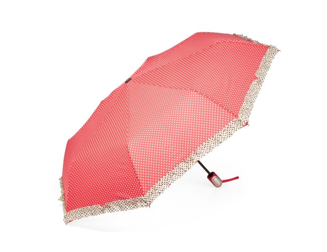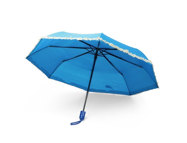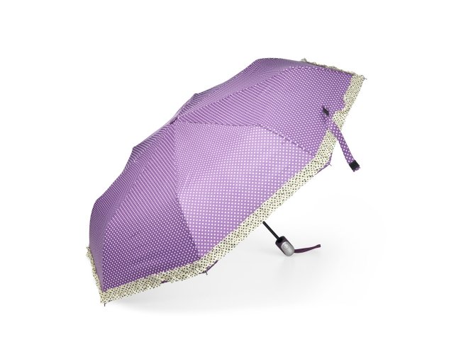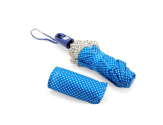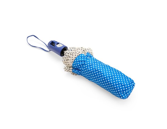 Guarda-chuva em poliéster com abertura automática por acionamento de botão. Possui estrutura metálica com oito varetas e pegador em plástico com alça de nylon fixa na ponta. Acompanha capa protetora.
