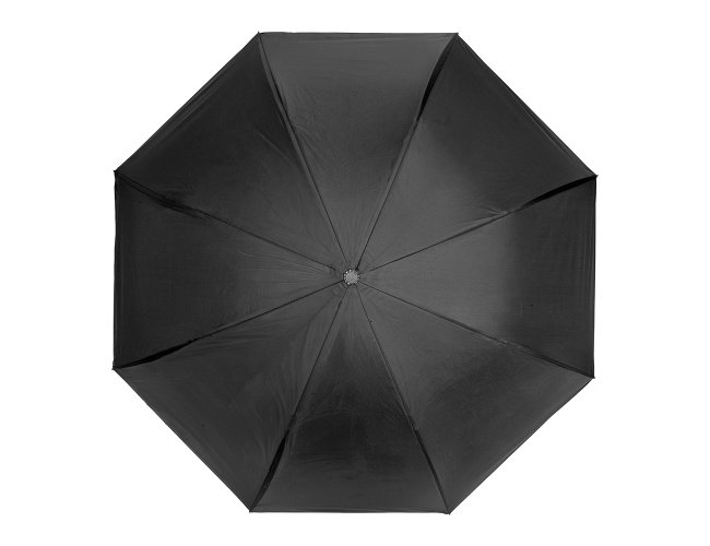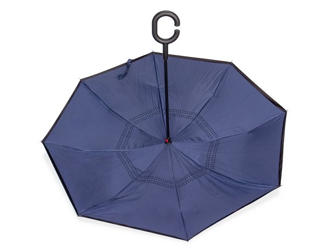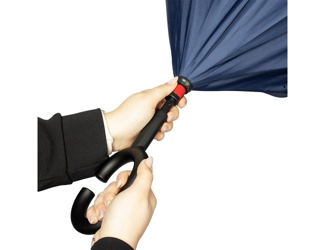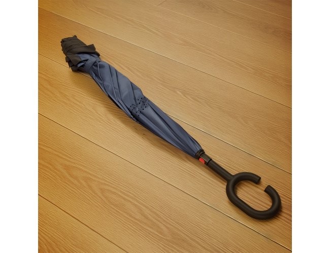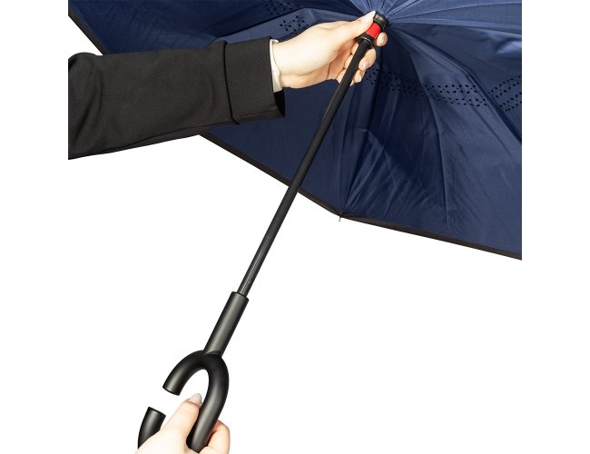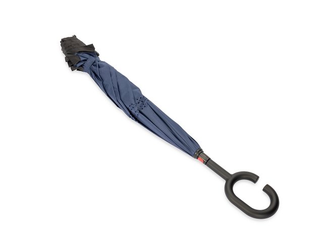 Guarda-chuva de abertura invertida manual em nylon impermeável com uma camada interna de forro. Possui estrutura metálica com oito varetas, além de pegador em plástico fosco no formato de C, botão para fechamento e fita com ponta em velcro para lacre.