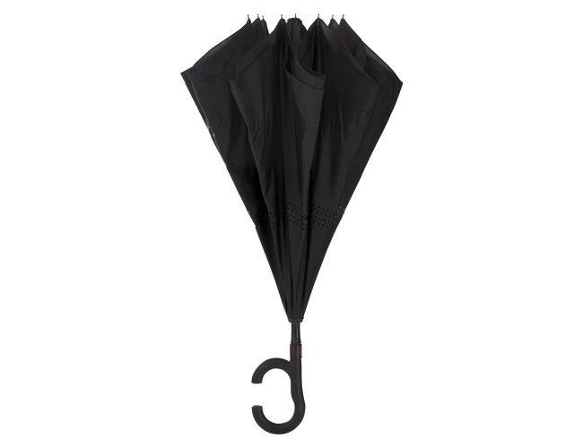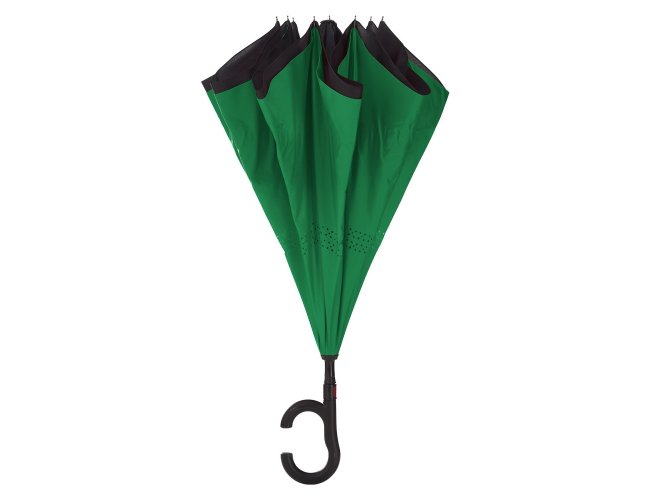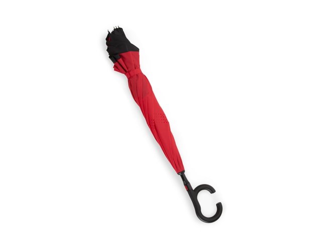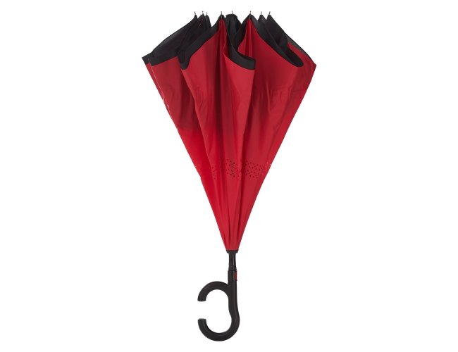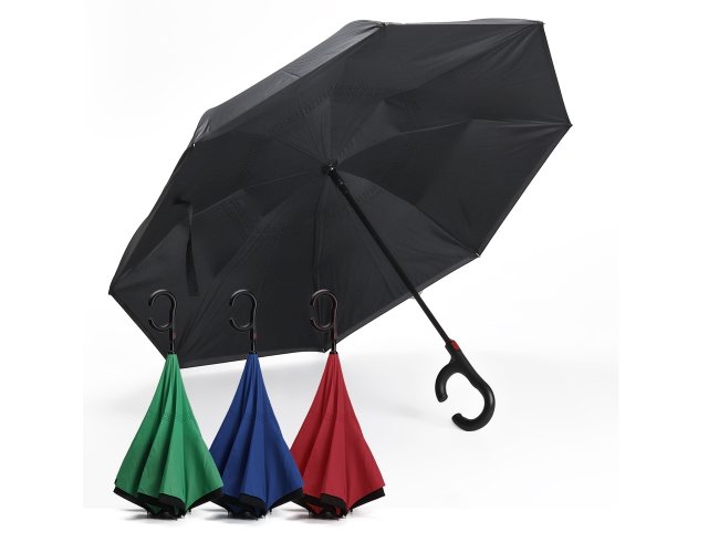 Guarda-chuva invertido com forro interno. Tecido ponge chinês e seda poliéster, possui um mecanismo inovador permitindo que o usuário não se molhe ao entrar e sair de ambientes devido sua abertura invertida, quando feito o movimento para fechar as varetas inverterão para cima criando um formato circular impedindo a chuva de atingir o usuário, podendo ?segurar? a chuva enquanto entra/sai de um ambiente, ao virar o guarda-chuva a água irá escorrer. Forro interno para preservação das 8 varetas, evitando contato com a água e assim prolongando seu tempo de uso sem enferrujar. Ao impulsionar o fechamento invertido fica mais rápido e prático o modo de secar e ser guardado, pode ser apoiado no chão que permanecerá em pé para escorrer a água. Pegador plástico fosco em formato C, botão acionador vermelho e fita com velcro para lacre.