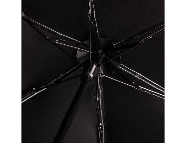 Guarda-chuva manual cápsula em poliéster de impacto impermeável e tecido interno em vinil. Com 6 varetas e estrutura em aço, possui pegador, botão de abertura e alça de Nylon. Acompanha estojo protetor com alça.
