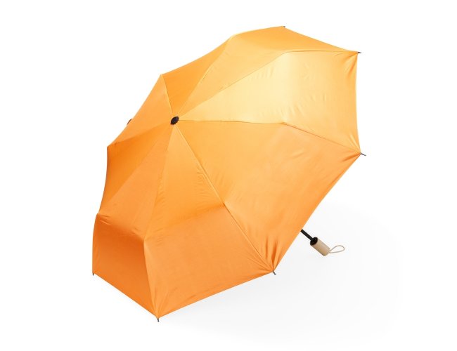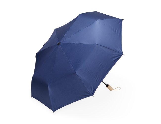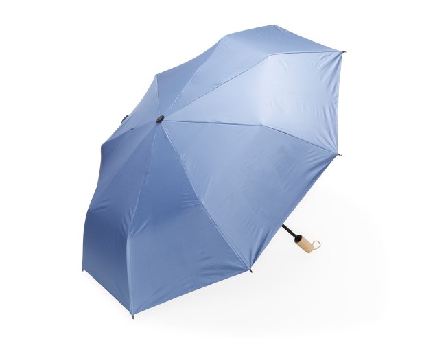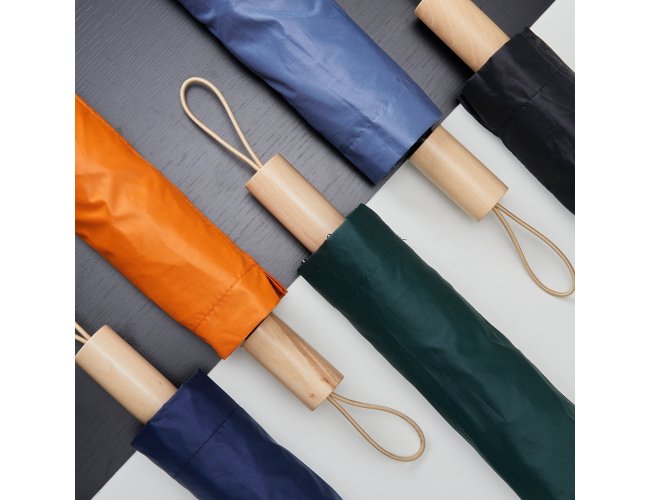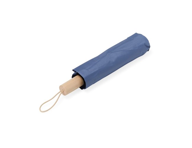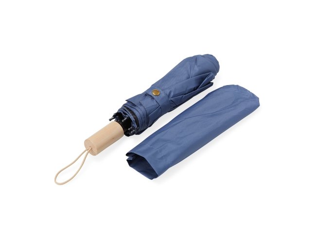Guarda-chuva manual de nylon com impacto impermeável e proteção UV, tecido interno em vinil. Com 8 varetas e estrutura em aço, possui botão de abertura e pegador de madeira com alça de nylon. Acompanha capa protetora.