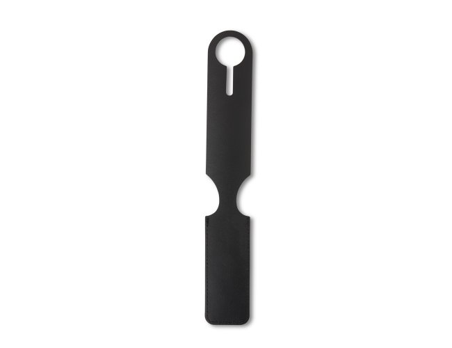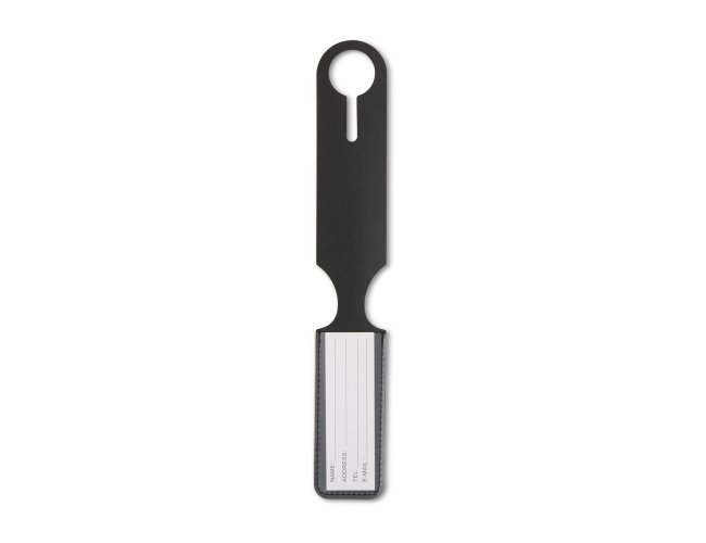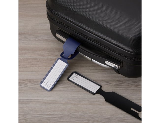 Tag identificador de bagagem em couro sintético. Parte frontal com abertura para visor plástico e verso liso.