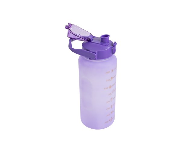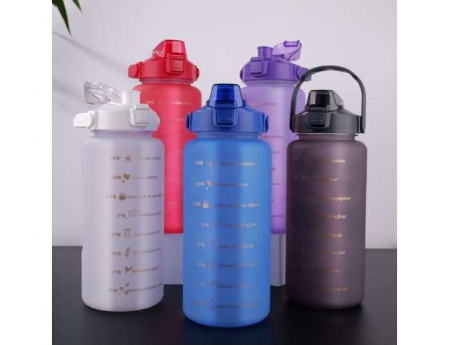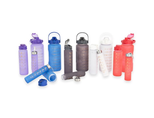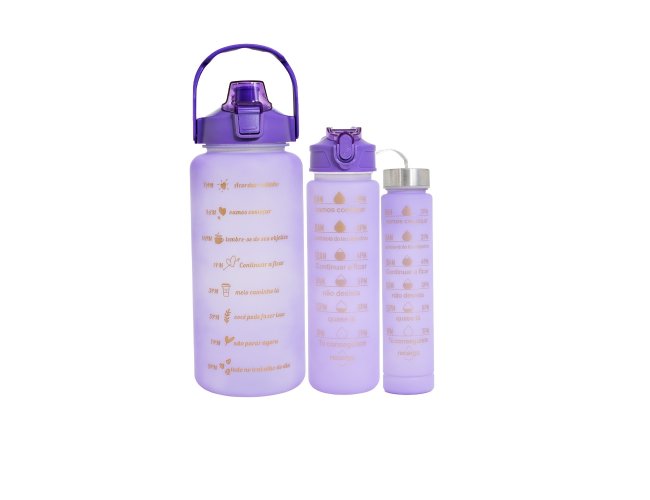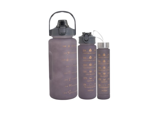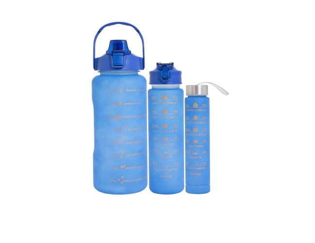 Kit com 3 garrafas plásticas, sendo um squeeze galão com capacidade de 2 litros, squeeze 750ml e garrafa 300ml. Squeeze 2L com alça para transporte e suporte para celular, botão de acionamento e tampa de proteção para o bocal; squeeze 750ml com botão de acionamento, trava de segurança e tampa protetora para o bico de silicone; garrafa 300ml com tampa de alumínio e alça de nylon para transporte. Acompanham dois canudos e acessórios de extensão de canudo.