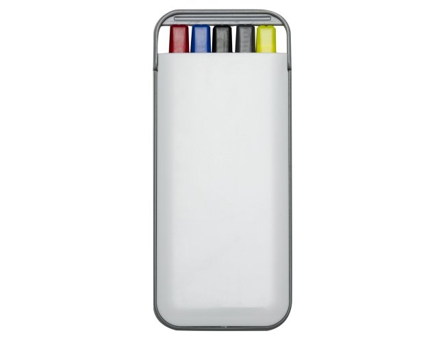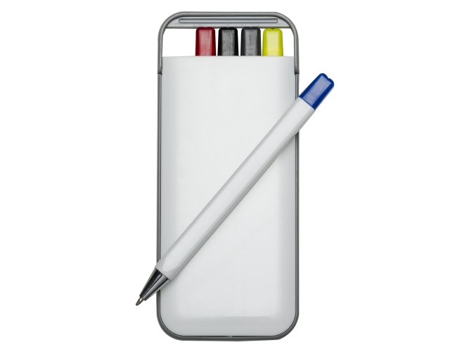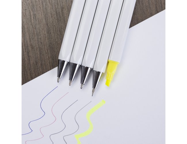 Kit 5 em 1 branco em estojo plástico, contém canetas com as cargas: azul, preto e vermelho; marca texto amarelo e lapiseira.