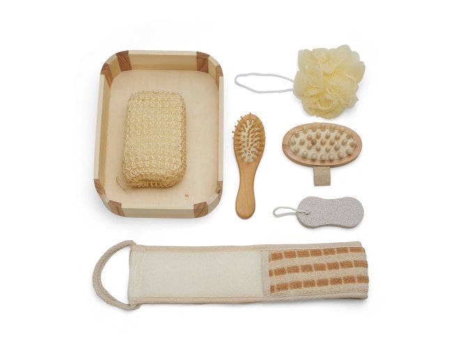 Kit banho em caixa de madeira com 6 peças, contém: toalha esfoliante, escova de cabelo, esponja de banho, bucha de banho, pedra pomes e massageador. OBS.: PEDIDO MÍNIMO 10 PEÇAS!
