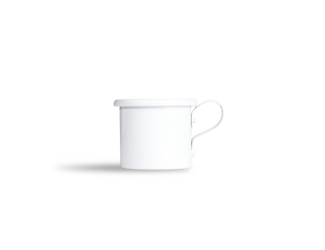 Kit Café 3 Peças contém: xícara de 120ml em metal, base de madeira com suporte para coador, e mini coador de café em tecido.