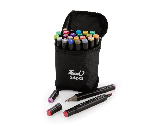 Kit com 24 canetas marcadoras feitas em plástico com pontas duplas: uma fina e outra chanfrada grossa. Acompanham bolsa com alça e fechamento em zíper para transporte.