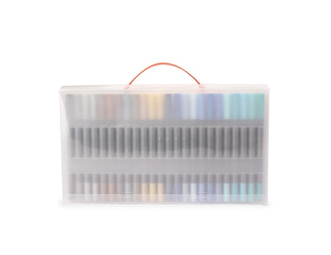 Kit com 72 canetinhas coloridas de pontas duplas: uma fina e outra em formato de pincel. Cada canetinha possui corpo leve em plástico e tinta à base de água, livre de odores e atóxica. Acompanha estojo plástico com fechamento em botões e alça para transporte.
