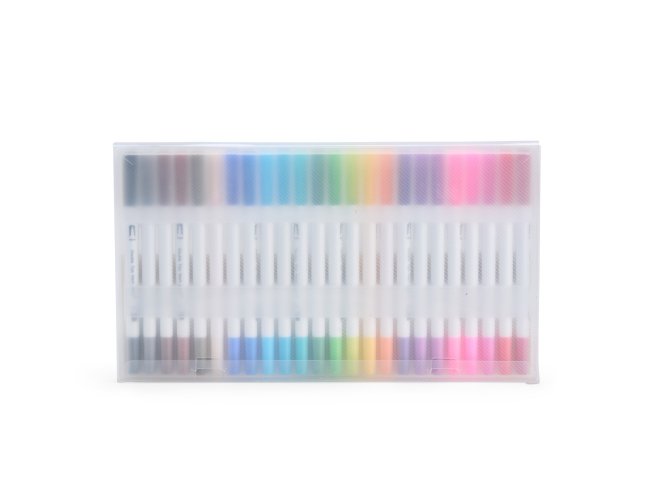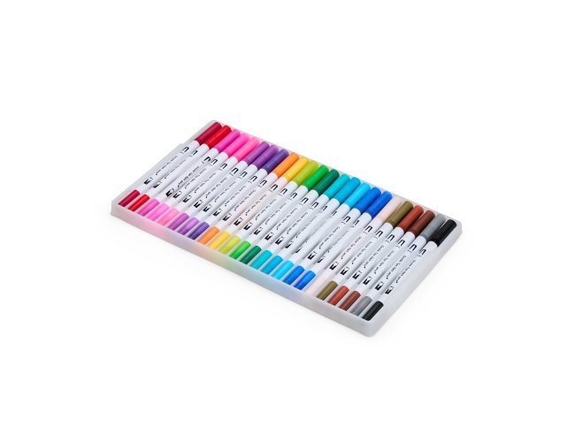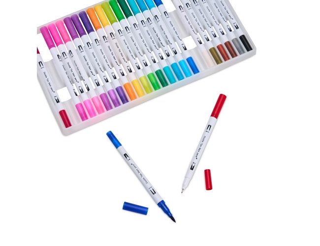 Este é um kit com 24 canetinhas de cores únicas e distintas com pontas duplas: uma fina e a outra em formato de ponta pincel. Apresenta uma variedade de cores ideais para favorecer a criatividade para a elaboração dos mais diversos tipos de atividades como desenho, pintura e escrita. Cada canetinha é à base de água, não tóxica e livre de odores, tudo para garantir mais segurança durante o uso. O kit de canetinhas vem em um estojo em plástico com dois botões frontais para fechamento prático. Observação: não adequado para crianças menores de 3 anos.