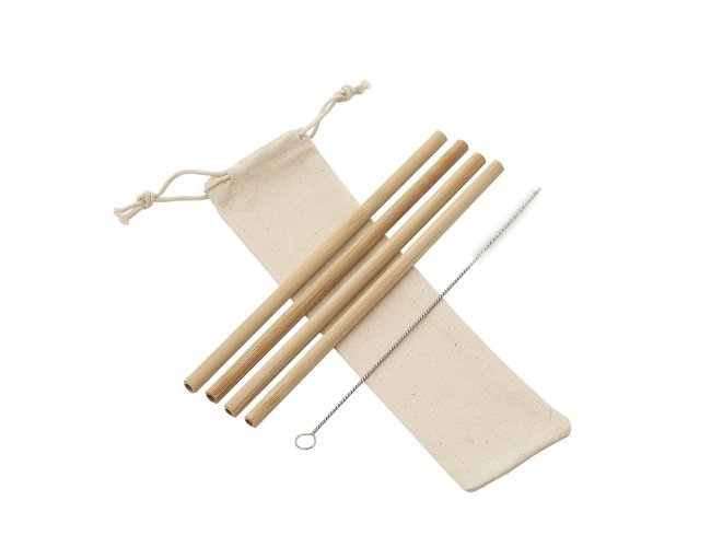Kit canudo de bambu reto e escova de limpeza em estojo. Contém 4 canudos de bambu e escova de limpeza com ponteira plástica. Acompanha estojo de algodão reciclado.