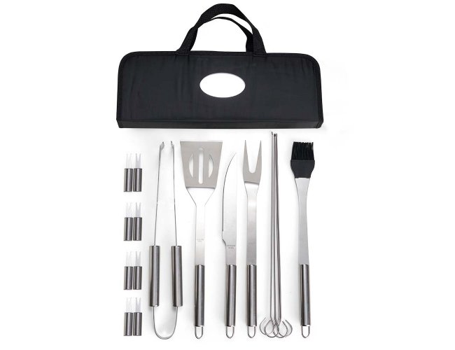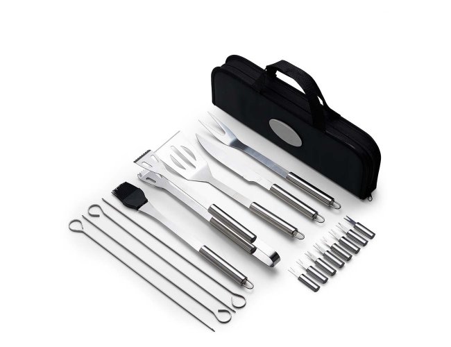 Kit Churrasco 17 Peças em estojo de nylon com alça. Contém: pegador, garfo, espátula, faca, pincel, 4 espetos e 8 garfos pequenos para petiscos. Utensílios de inox com proteções plásticas e parte interna com velcro para fixação das peças, acompanha plaquinha metálica para personalização.