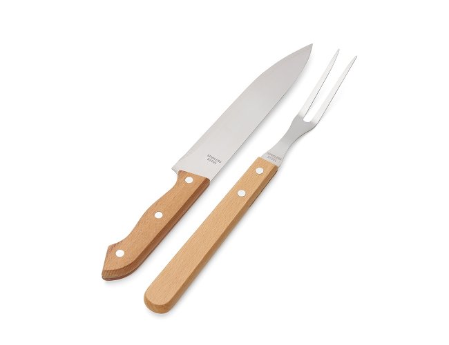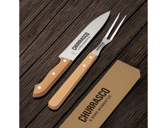 Kit churrasco 2 peças. Contém: garfo e faca, acompanha embalagem de kraft.