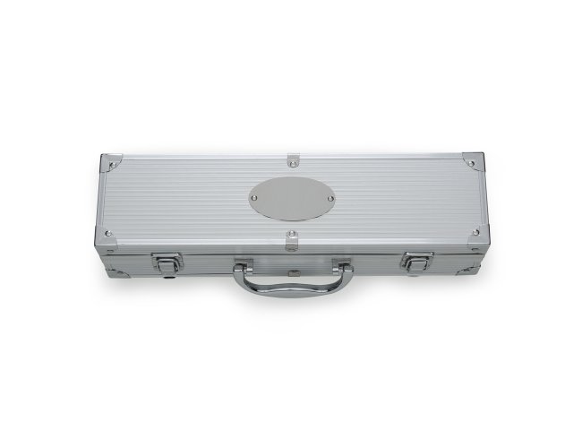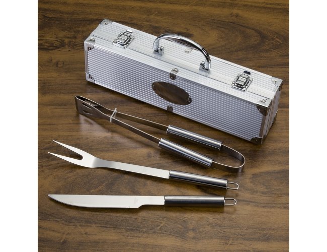 Um kit churrasco que oferece qualidade e precisão no preparo de carnes e outros alimentos. O conjunto apresenta três peças em aço inox: um pegador, um garfo e uma faca de corte com lâmina de 6 polegadas. Além disso, os utensílios são acomodados em maleta de alumínio com revestimento interno em TNT e plaquinha para personalização.