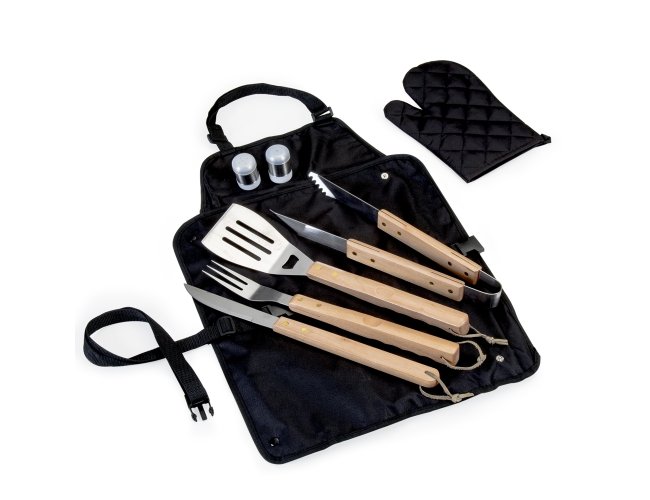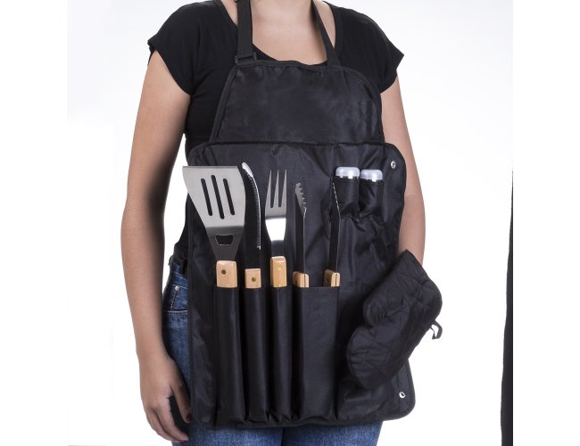 Kit churrasco 8 peças em estojo de nylon. Contém espátula, garfo, faca, pegador, saleiro, paliteiro, luva e avental (também utilizado como estojo). Talheres de inox com acabamento de madeira e avental de nylon com alça ajustável ? possui botão e alça com fivela para lacre.