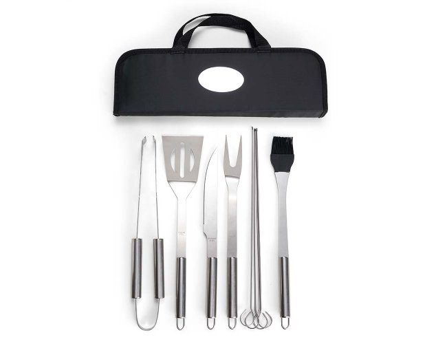 Kit Churrasco 9 Peças em estojo de nylon com alça. Contém: pegador, garfo, espátula, faca, pincel e 4 espetos. Utensílios de inox com proteções plásticas e parte interna com velcro para fixação das peças, acompanha plaquinha metálica para personalização.