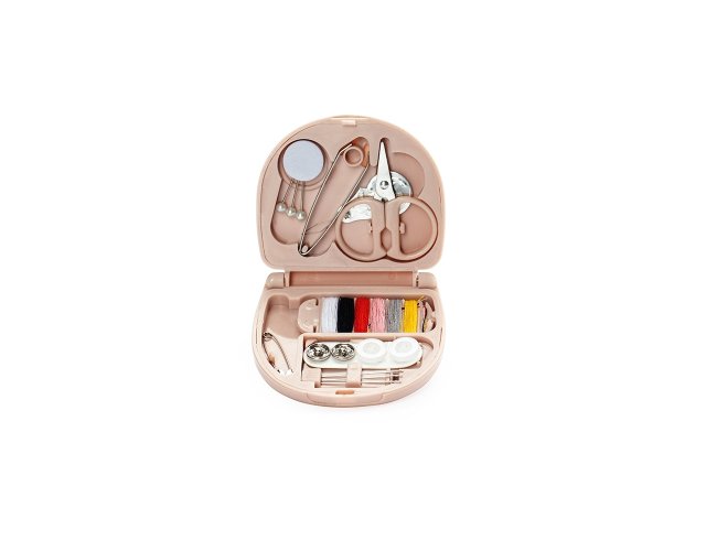 Kit de costura com embalagem plástica de acabamento brilhante e trava para fechamento. O conjunto inclui: três alfinetes de cabeça, uma pinça, um passador de linha, uma tesoura, um alfinete de segurança, um jogo de linhas com seis cores diferentes, dois botões, dois colchetes de pressão e três agulhas pequenas.