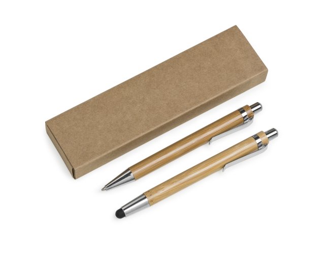 Kit ecológico caneta e lapiseira em bambu com estojo de papelão. Caneta bambu com clip metálico e possui borracha touch na parte inferior, quando aciona a esferográfica (clique) ela sai através do touch. Lapiseira bambu com clipe metálico, aciona por clique.