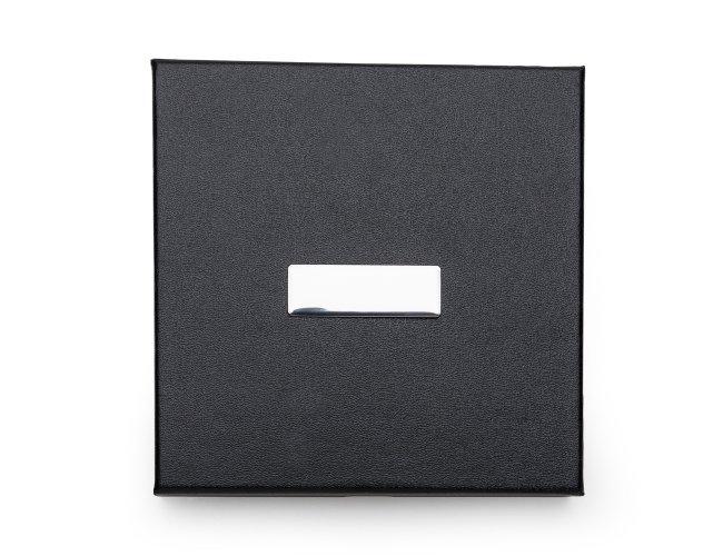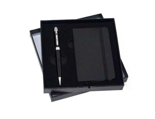 Kit executivo 2 peças em estojo de papelão com tampa e parte interna revestida de espuma. Contém: caneta metal preta com anel, detalhes em prata e escrita preta; caderneta emborrachada com aproximadamente 80 folhas amarelas com pauta. Acompanha placa metálica para gravação.
