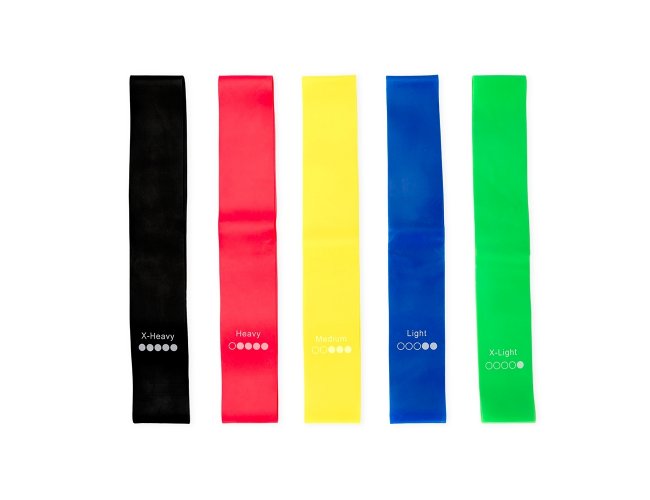 Kit com cinco faixas de borracha com diferentes níveis de resistência, oferecendo a elasticidade ideal para a prática de diversos tipos de atividades físicas. O conjunto acompanha um estojo plástico para guardar as faixas.