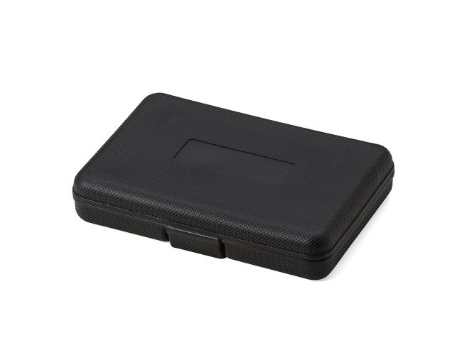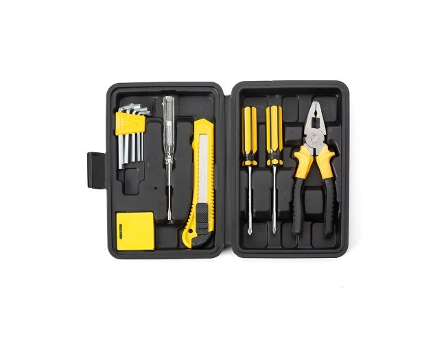 Kit ferramenta 11 peças em estojo plástico. Maleta plástica com detalhe retangular no centro frontal e verso com o detalhe na lateral inferior, possui texturização no estojo e uma trava superior. Acompanha: conjunto de 5 chaves Allen, trena de 1 metro, chave teste, estilete, chave Philips, chave de fenda e alicate.